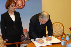 Fot.8 Prezydent Lech Kaczyński wpisuje się do księgi pamiątkowej nyskiej uczelni