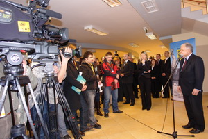 Fot.9 Prezydent Lech Kaczyński podczas Konferencji prasowej w hallu rektoratu nyskiej uczelni
